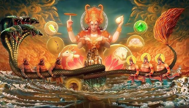 ইয়াৰ পিছত সাগৰৰ মন্থনৰ পৰা ইটোৰ পিছত সিটোকৈ ঐশ্বৰিক সম্পদ লাভ কৰা হৈছিল। দেৱী লক্ষ্মী সমৃদ্ধিৰে ওলাই আহে, আৰু শেষত, ভগৱান ধনবন্তৰী সাগৰৰ পৰা ওলাই আহে। তেওঁৰ হাতত আছিল অমৃতৰ পাত্ৰ আৰু আয়ুৰ্বেদৰ এখন প্ৰাচীন পুথি। তেওঁ লগত লৈ আহিছিল অমৰত্বৰ দান আৰু নিৰাময়ৰ জ্ঞান।