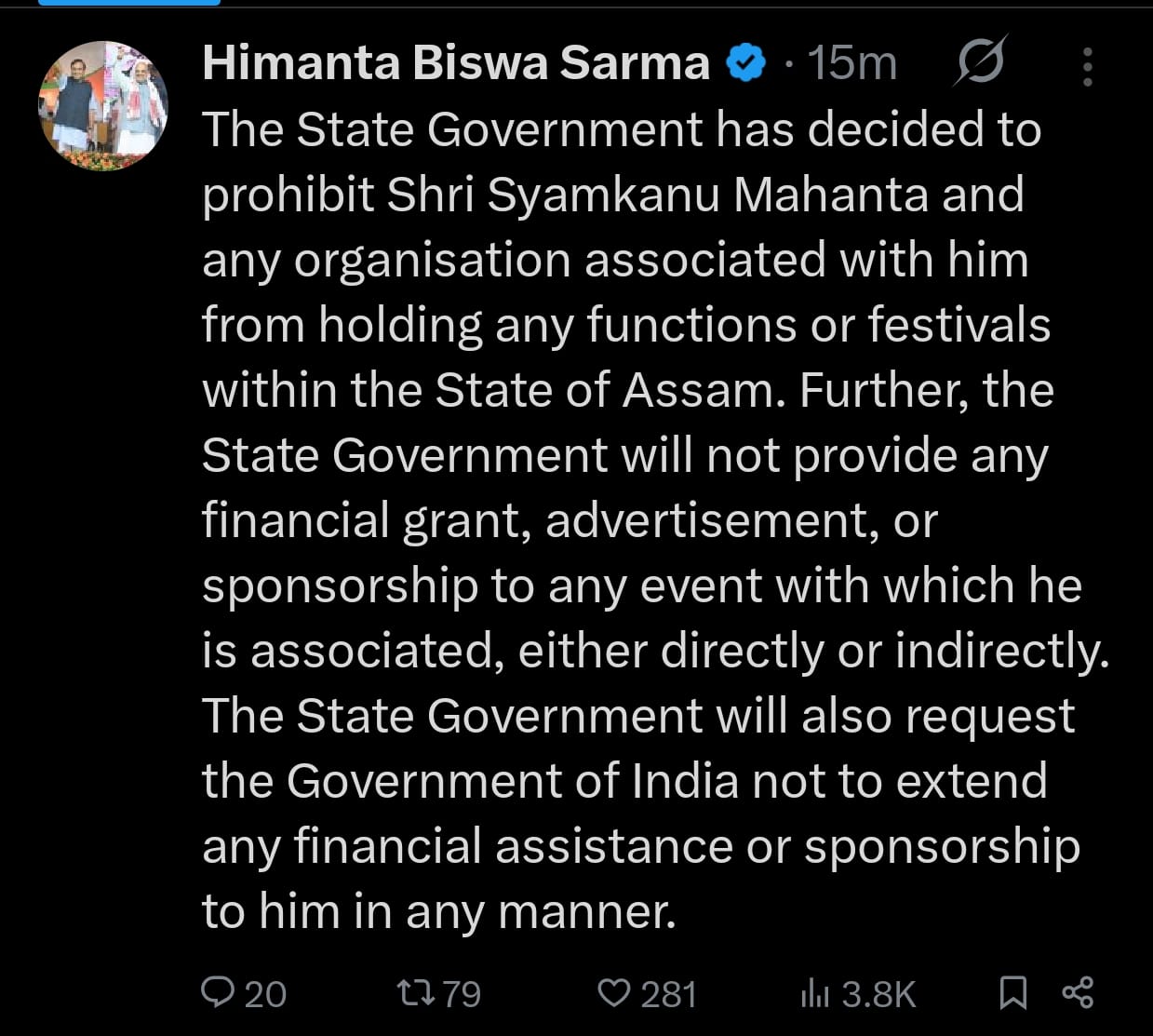 টুইটযোগে মুখ্যমন্ত্ৰীয়ে এই ডাঙৰ ঘোষণা কৰে। অসমত নিষিদ্ধ হ’ল শ্যামকানু মহন্তৰ সকলো অনুষ্ঠান। লগতে শ্যামকানু মহন্তৰ অনুষ্ঠানলৈ ৰাজ্য চৰকাৰে কোনো অনুদানো নিদিয়ে বুলি জানিবলৈ দিয়ে। ইয়াৰোপৰি শ্যামকানু জড়িত থকা বিজ্ঞাপন, স্পনচৰশ্বীপতো নিষেধাজ্ঞা আৰোপ কৰিছে। ৰাজ্য চৰকাৰে শ্যামকানু মহন্তৰ NGOক কোনো ধনো নিদিয়ে বুলি কয়।